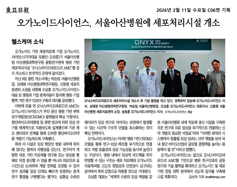 [NEWS] 동아일보, 오가노이드사이언스 서울아산병원에 세포처리시설 개소(헬스케어 소식/2026.02.11)